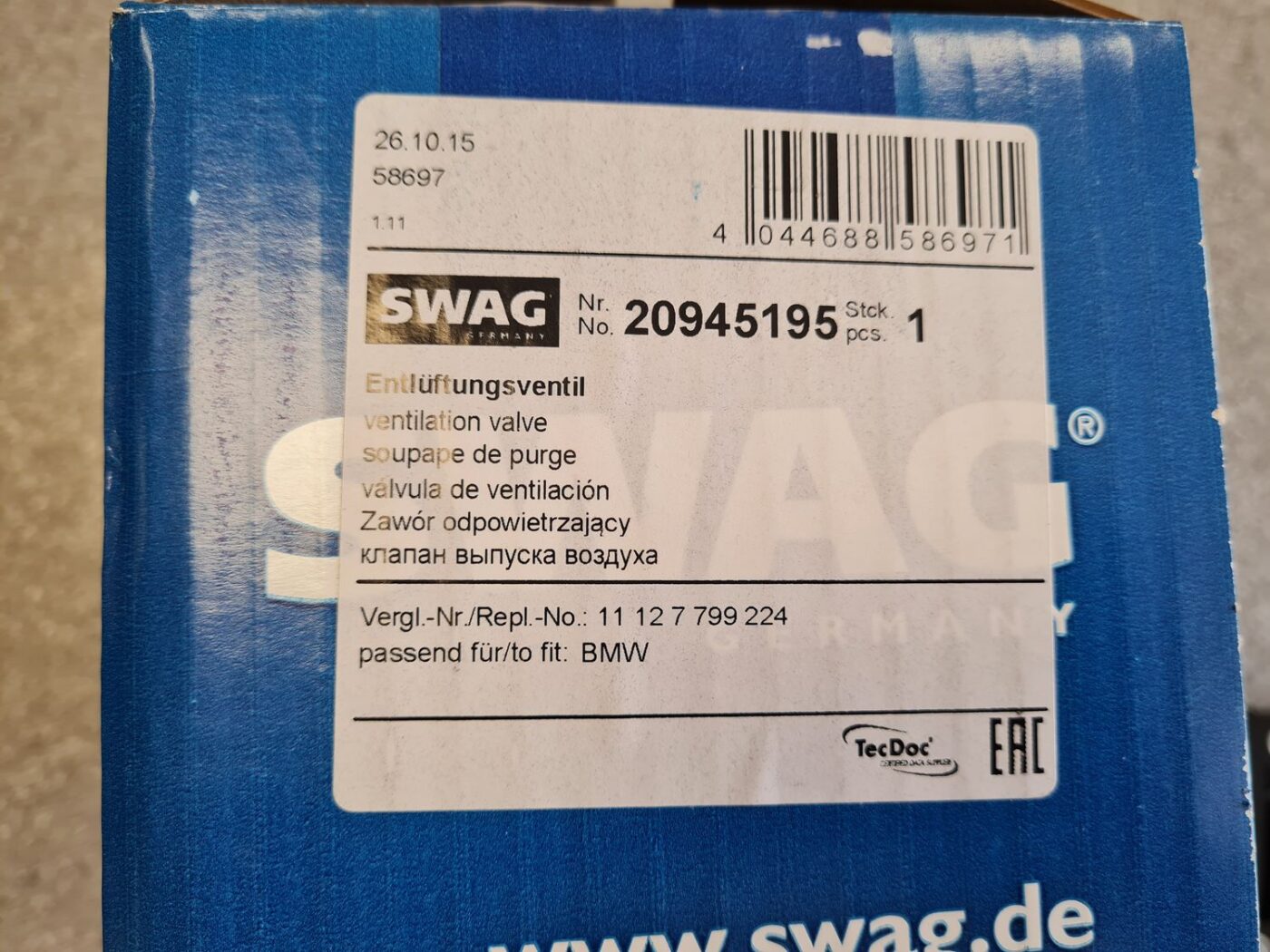 Kampikammion tuuletusventtiili varten SWAG 20945195 11127781465 11127789822