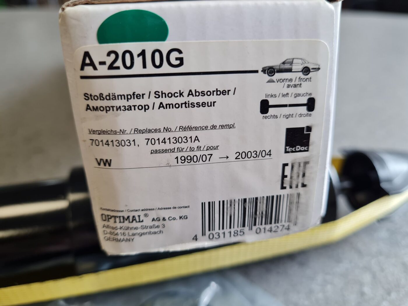 Priekšējais amortizators priekš OPTIMAL A2010G 701413031 7D0413031B ja muita ensiluokkaisia autotarvikkeita, shampoita ja sisäpuhdistustuotteita luotettavalta autotarvikeliikkeeltä, joka on erikoistunut kattavaan autonhoitoon ja -puhdistukseen.