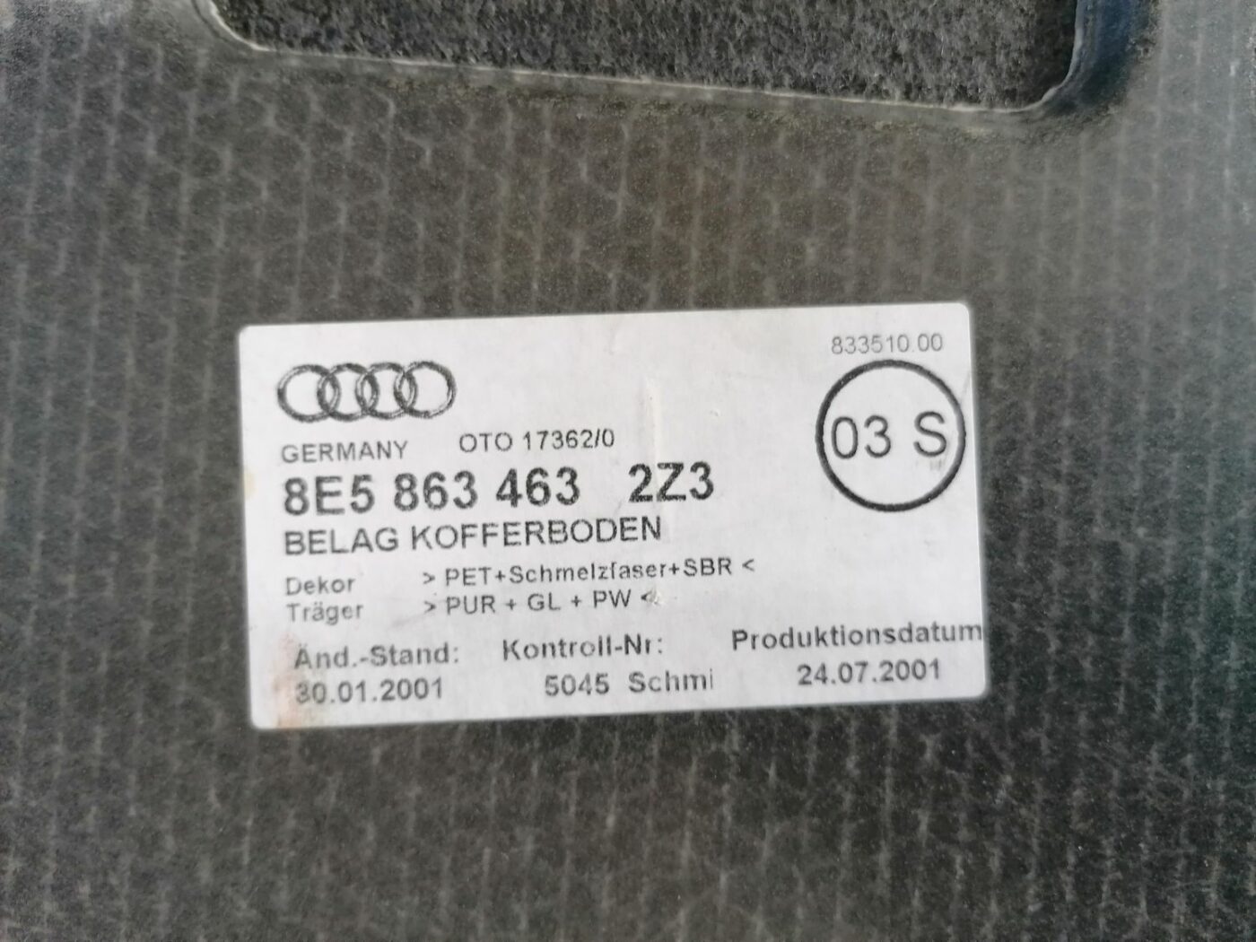 Tavaratilan lattia varten AUDI A4 2001 SEDAN 8E5863463-1 ja muita ensiluokkaisia autotarvikkeita, shampoita ja sisäpuhdistustuotteita luotettavalta autotarvikeliikkeeltä, joka on erikoistunut kattavaan autonhoitoon ja -puhdistukseen.